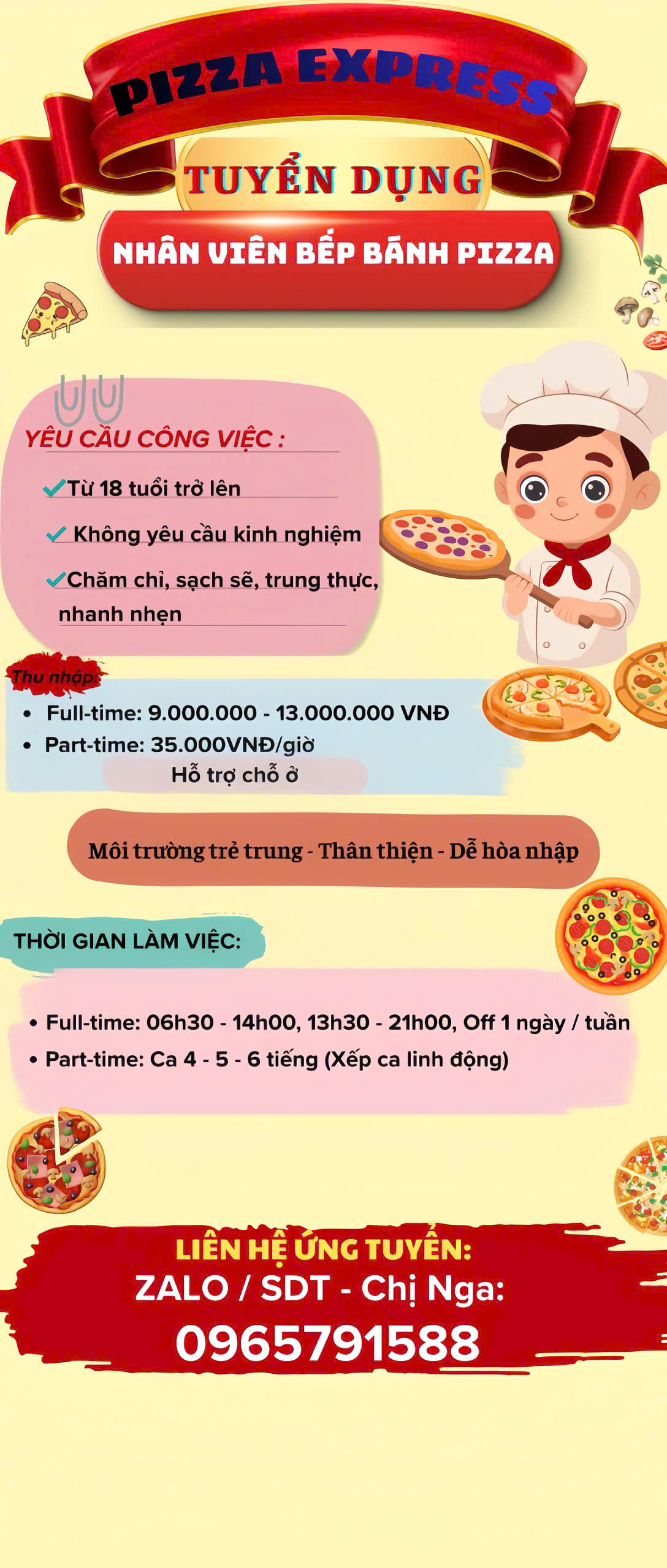 Pizza Express cùng với đội ngũ nhân viên mang đầy sức trẻ và nhiệt huyết, chúng tôi luôn mong muốn đem lại cho khách hàng của mình chất lượng dịch vụ tốt nhất, luôn lắng nghe và chăm sóc những nhu cầu dù là nhỏ nhất của Quý khách.