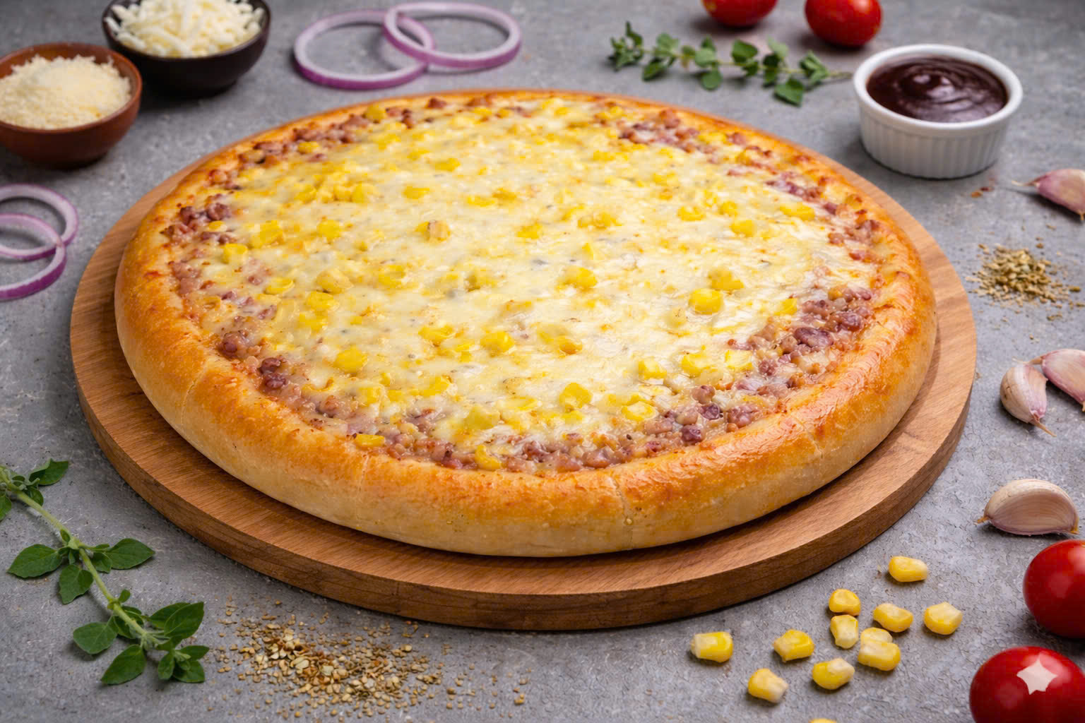 Thịt bò xay, ngô, sốt BBQ, pho mai.