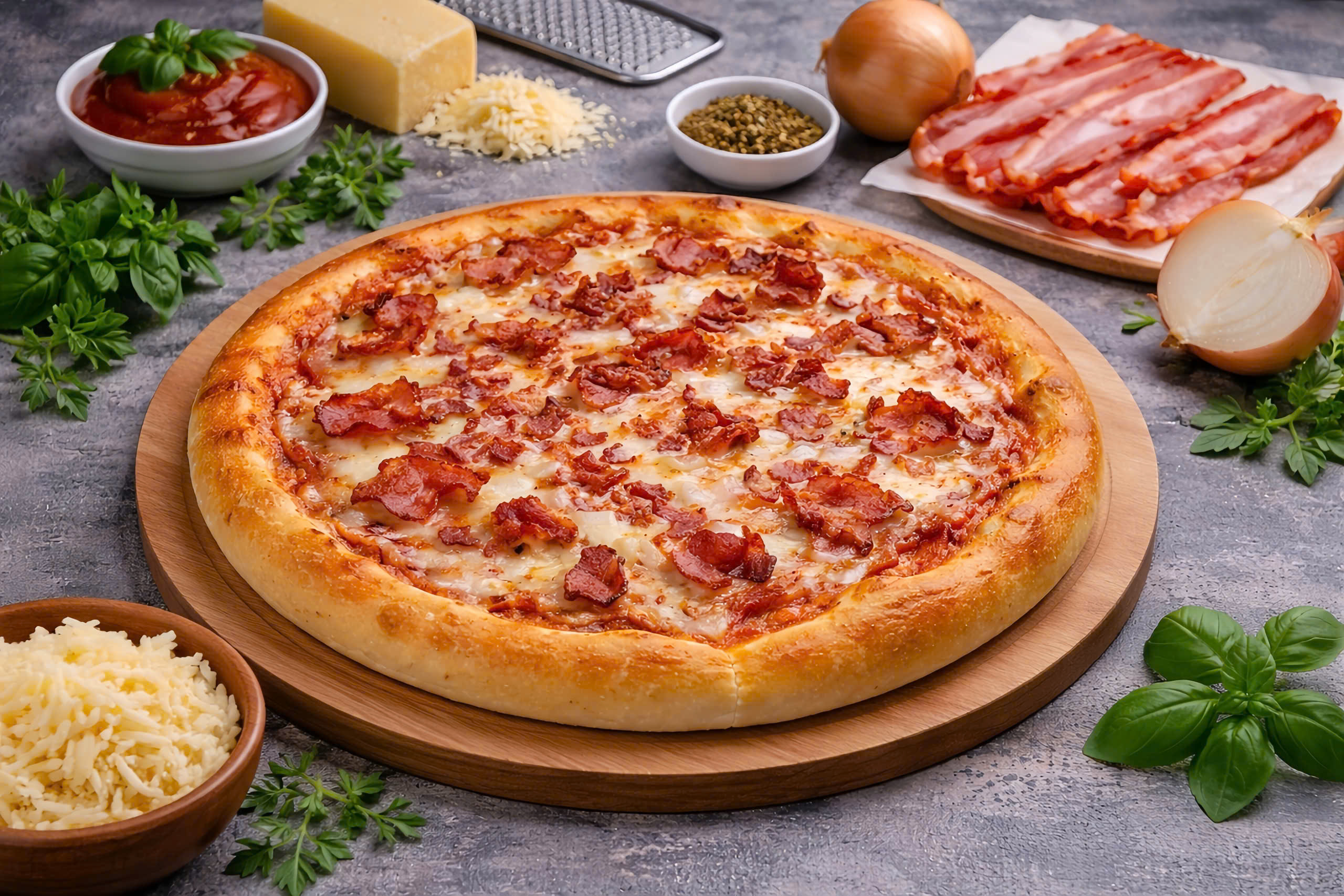 Ba chỉ xông khói, sốt cà chua, phomai, hành tây