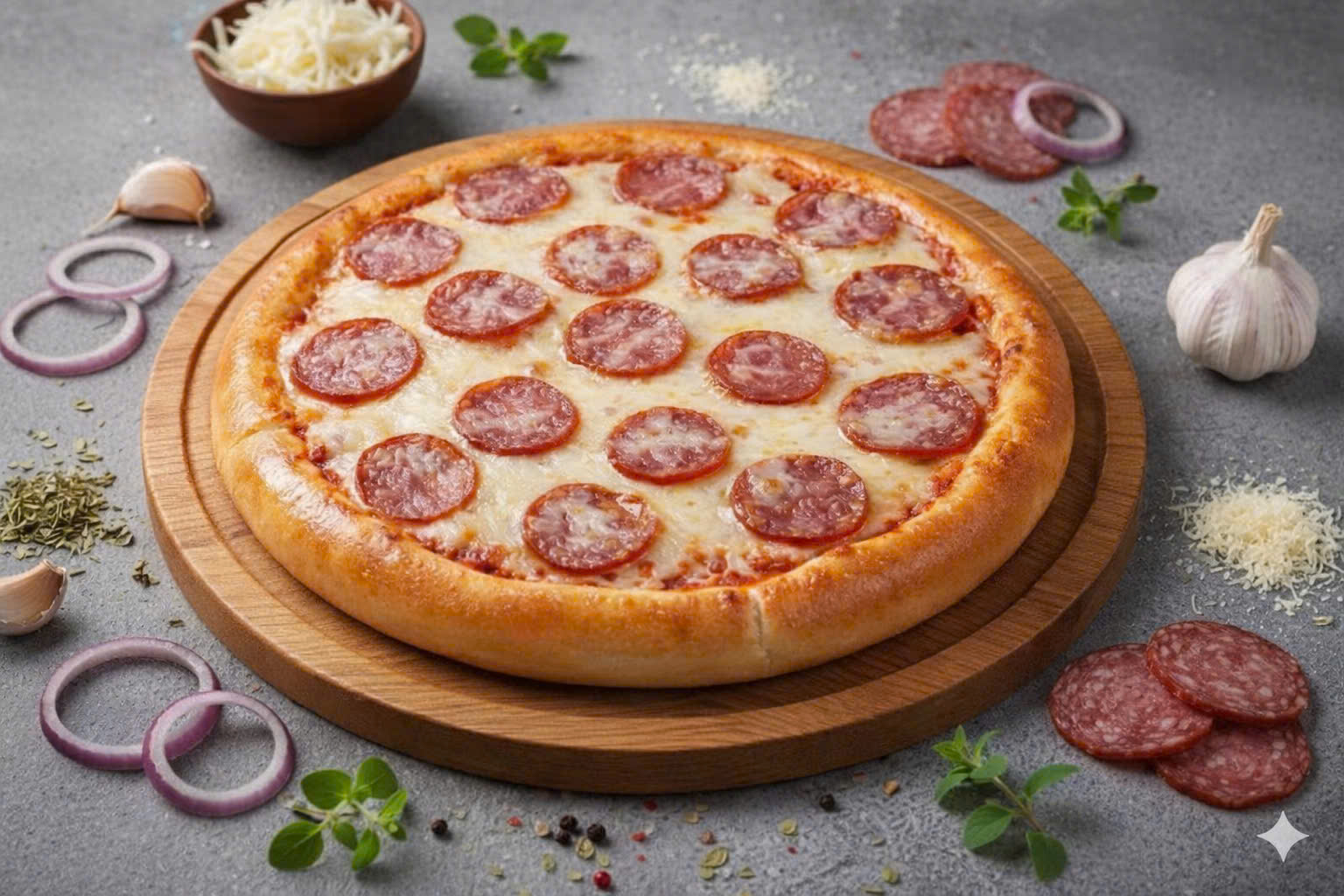 Xúc xích Salami, hành tây, sốt cà chua, pho mai.