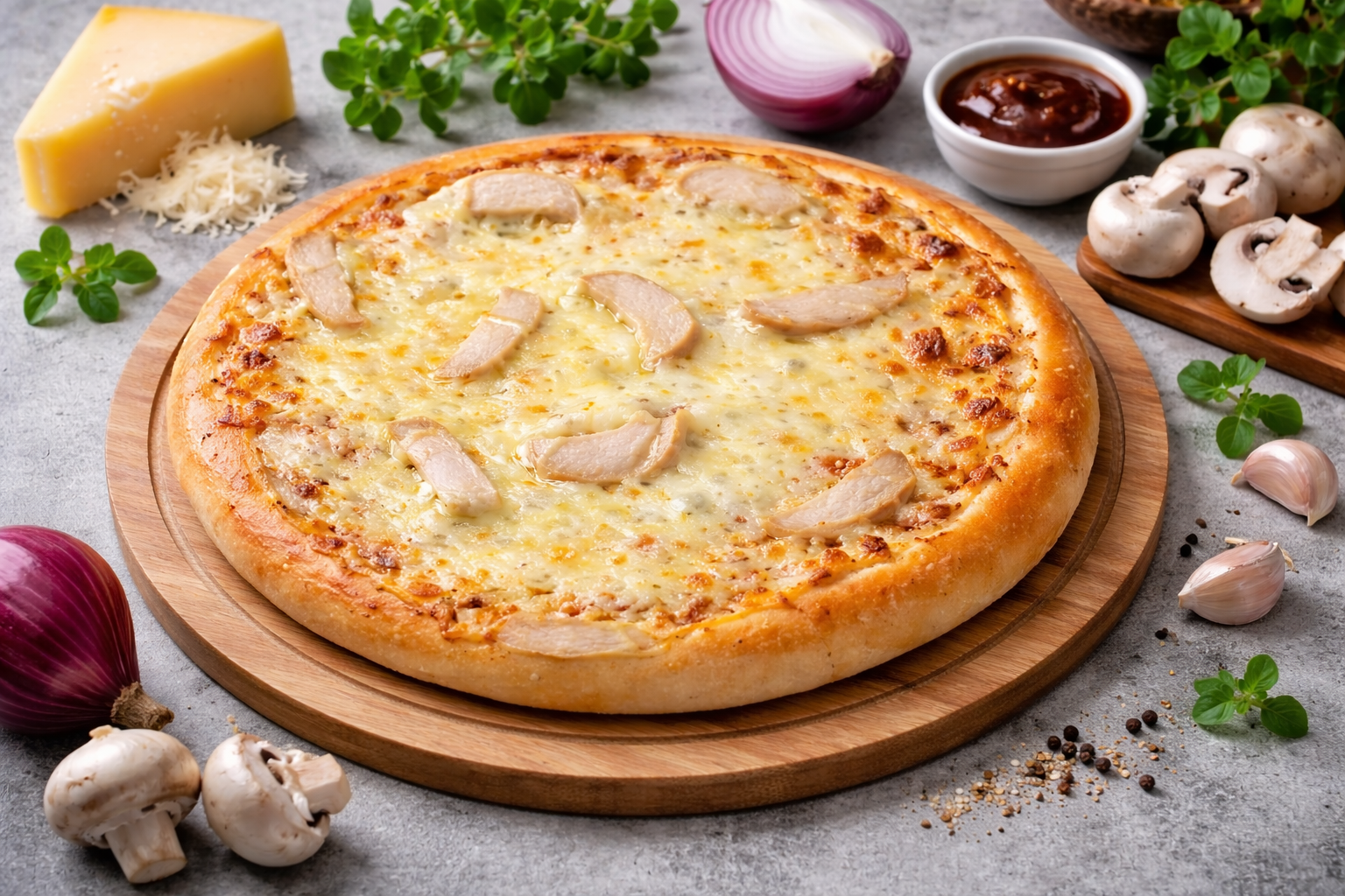 Thịt gà xay, nấm, sốt BBQ, pho mai.