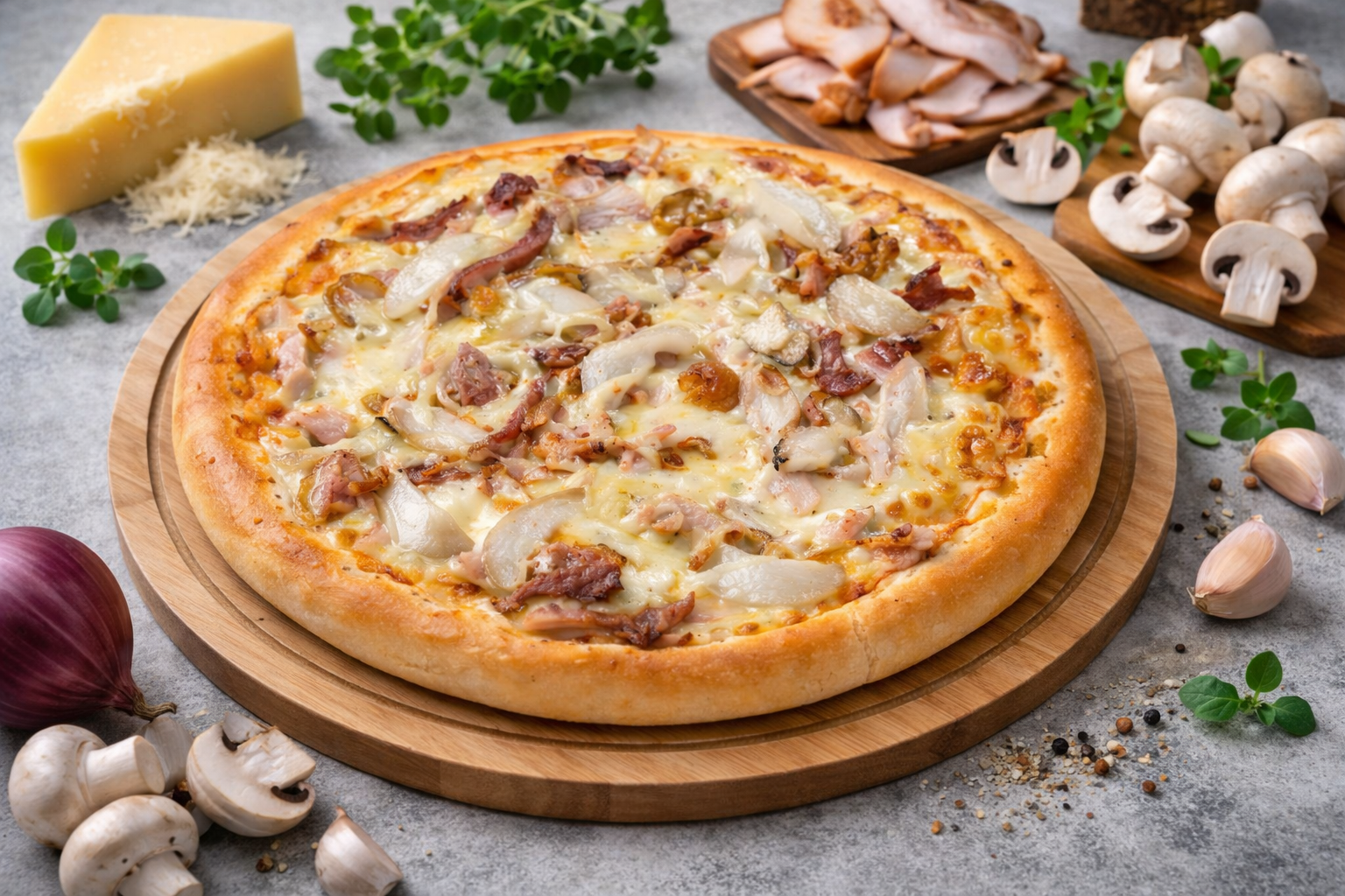Thịt gà hun khói, nấm, sốt cà chua, pho mai.